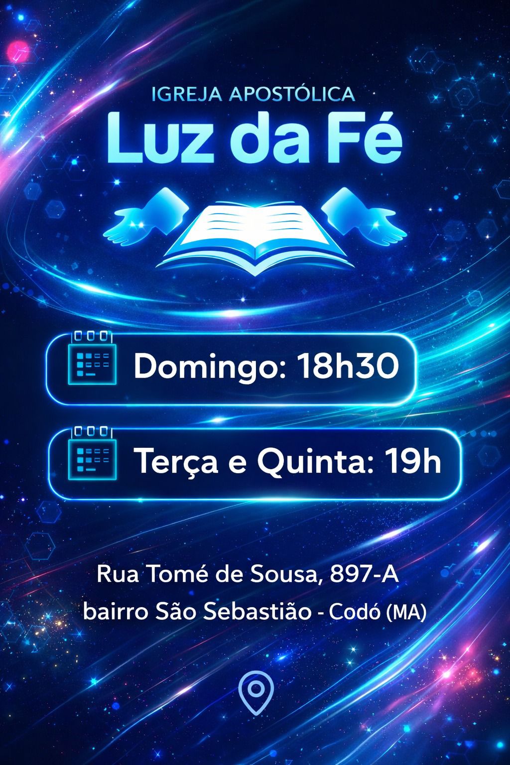 Localizada na Rua Tomé de Souza, em Codó-MA, nossa igreja é guiada por princípios apostólicos, focada na restauração de vidas e no fortalecimento das famílias através da Palavra de Deus.